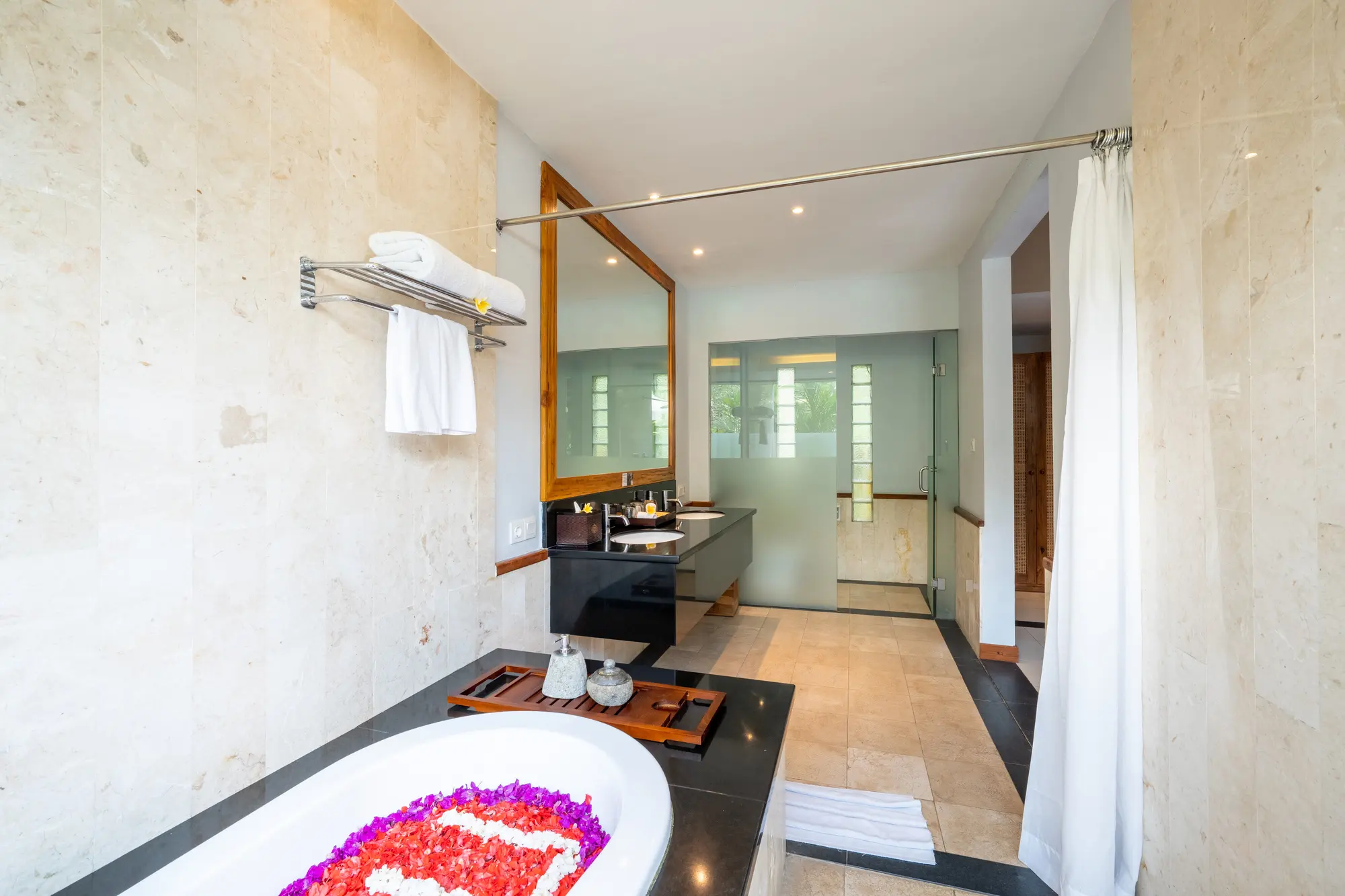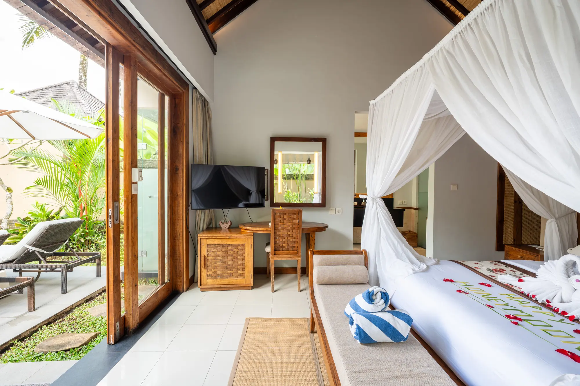 The villas come with double bed, catering to your specific needs, ensuring a restful stay with our King Koil pillow-top mattress. Elevate your relaxation in the lavish en-suite bathrooms, featuring luxurious bathtubs and refreshing rain showers. The spacious terrace with a private pool in each villa invites you to unwind and immerse yourself in the serene riverside ambiance, enhancing your Ubud resort experience. Every detail, from modern amenities to thoughtful design, is curated to create an unparalleled sense of harmony and elegance.